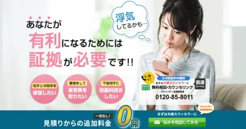 | 料金 | 調査員1名あたり1時間8,800円(税込) 基本料金:44,000円(税込) 初めてパック: 55,000円(税込) 3時間限定の初動調査プラン 5時間の調査で報告書を省き、ホテルの出入りなどの証拠写真を重視したプラン |
